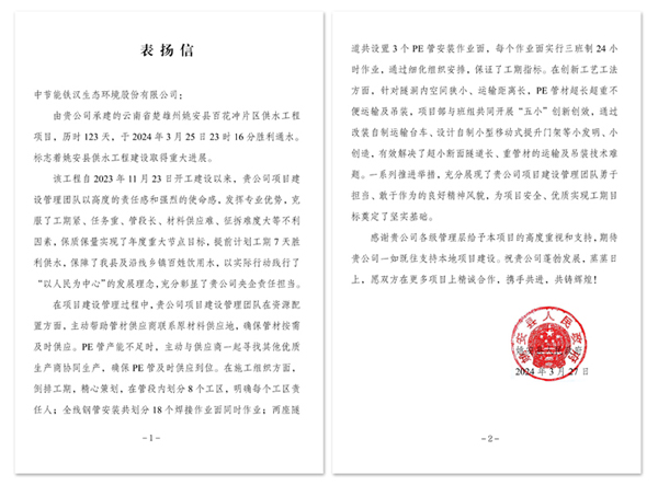 姚安县人民政府专程发来《表扬信》,指出,项目自2023年11月23日开工建设以来,中节能铁汉项目建设管理团队以高度的责任感和强烈的使命感,发挥专业优势,克服了工期紧、任务重、管段长、材料供应难、征拆难度大等不利因素,保质保量实现了年度重大节点目标并提前7天供水,保障了姚安县及沿线乡镇百姓饮用水,对助力当地乡村振兴具有重要作用,以实际行动践行了“以人民为中心”的发展理念,充分彰显了央企责任担当。