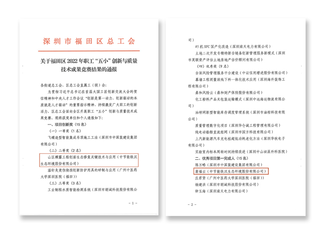近日,由深圳市福田区总工会举办的2022年福田区职工“五小”创新与质量技术成果竞赛揭晓评选结果。中节能铁汉参赛项目“山区裸露工程创面生态修复关键技术与应用”荣获创新奖二等奖,担任该项目主要负责人的裴福云博士获评“优秀项目第一完成人”。