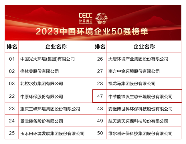 喜报 | 中节能铁汉连续6年荣登“中国环境企业50强”榜单